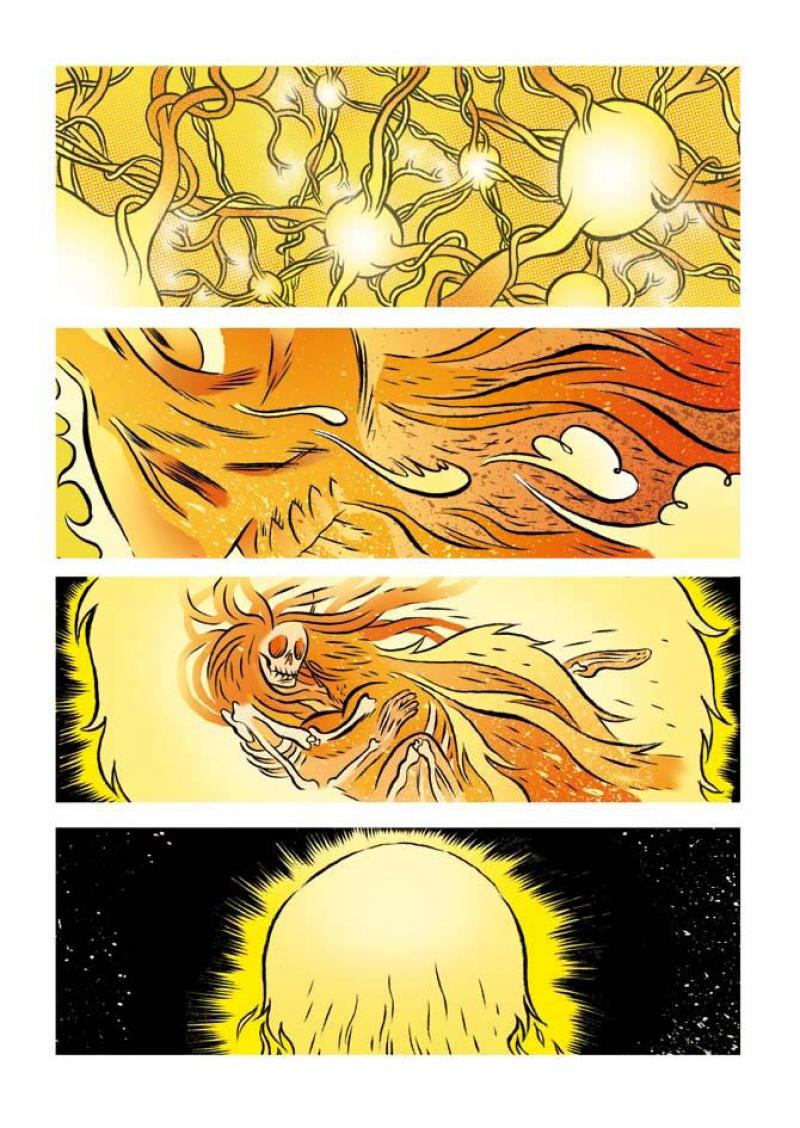 Estas páxinas que fan parte do comezo do cómic, son quizais as máis tranquiliñas a nivel formal. Máis adiante a cousa desmádrase moito máis e hai moitos máis xogos narrativos, explica o autor, que recoñece que o formato escolleito para historia, lle permitiu experimentar libremente. O bo de traballar nun formato que non implica un límite de páxinas determinado como pode pasar no mercado americano no álbum francobelga de 42 ou 64 páxinas. Nese sentido son formatos que limitan moito, sobre todo para tebeos que se centran nas aventuras e na acción. O que eu buscaba coas secuencias de acción e a ventura que hai ao longo do libro é voltar un pouco a esa emoción de cando eu era pequeno e lía a Jack Kirby ou cousas así. Tamén me apetecía o reto de facer secuencias de acción diferentes ás que se adoitan ver na BD, acelerar e decelerar o ritmo de lectura, xogar con splash pages e disposicións dos paneis de xeito que acompañasen a acción tanto a nivel narrativo como emocional. Para min cando menos foi unha gozada, algo co que disfrutei aínda que resultou difícil de levar a cabo. Algunha secuencia de acción chega a corenta páxinas e o reto foi xustamente non caer na repetición, non empregar os mesmos recursos narrativos e procurar que o o personaxe non se mova nin salte igual.