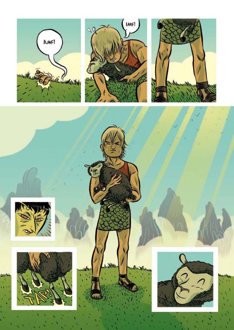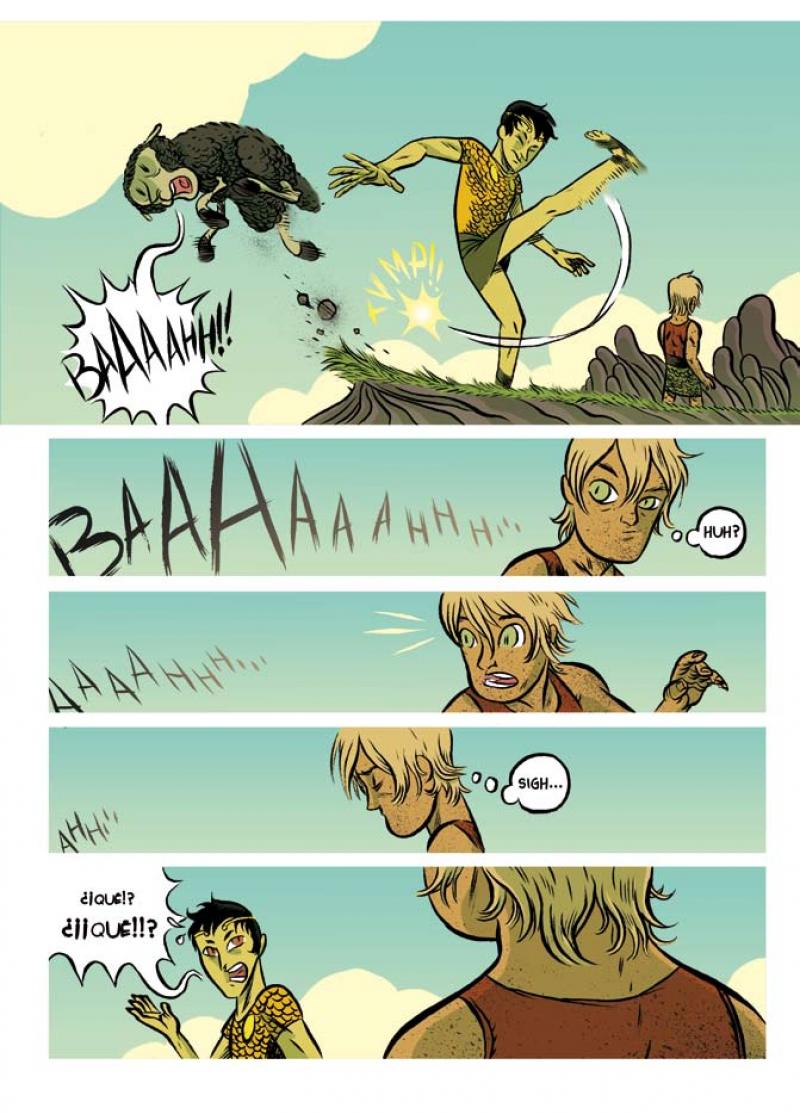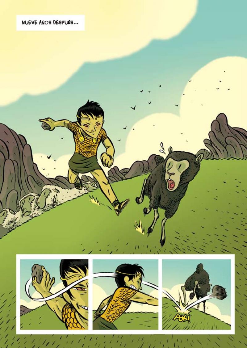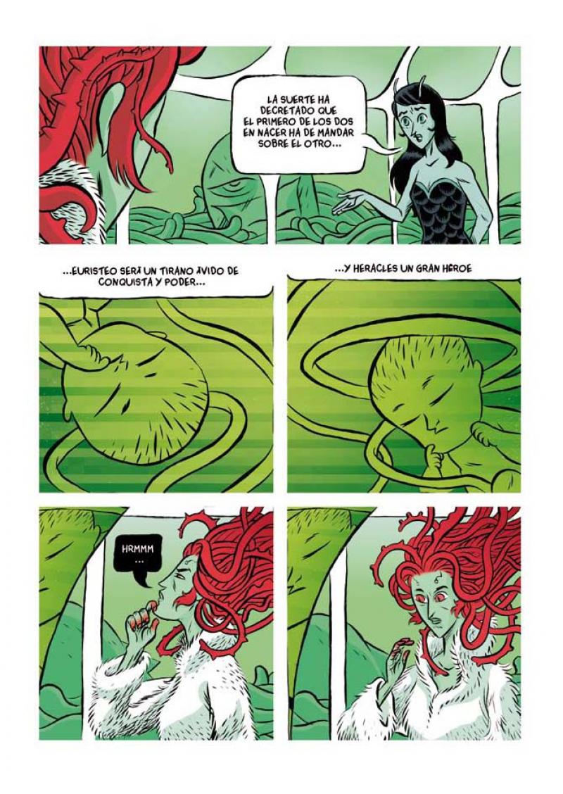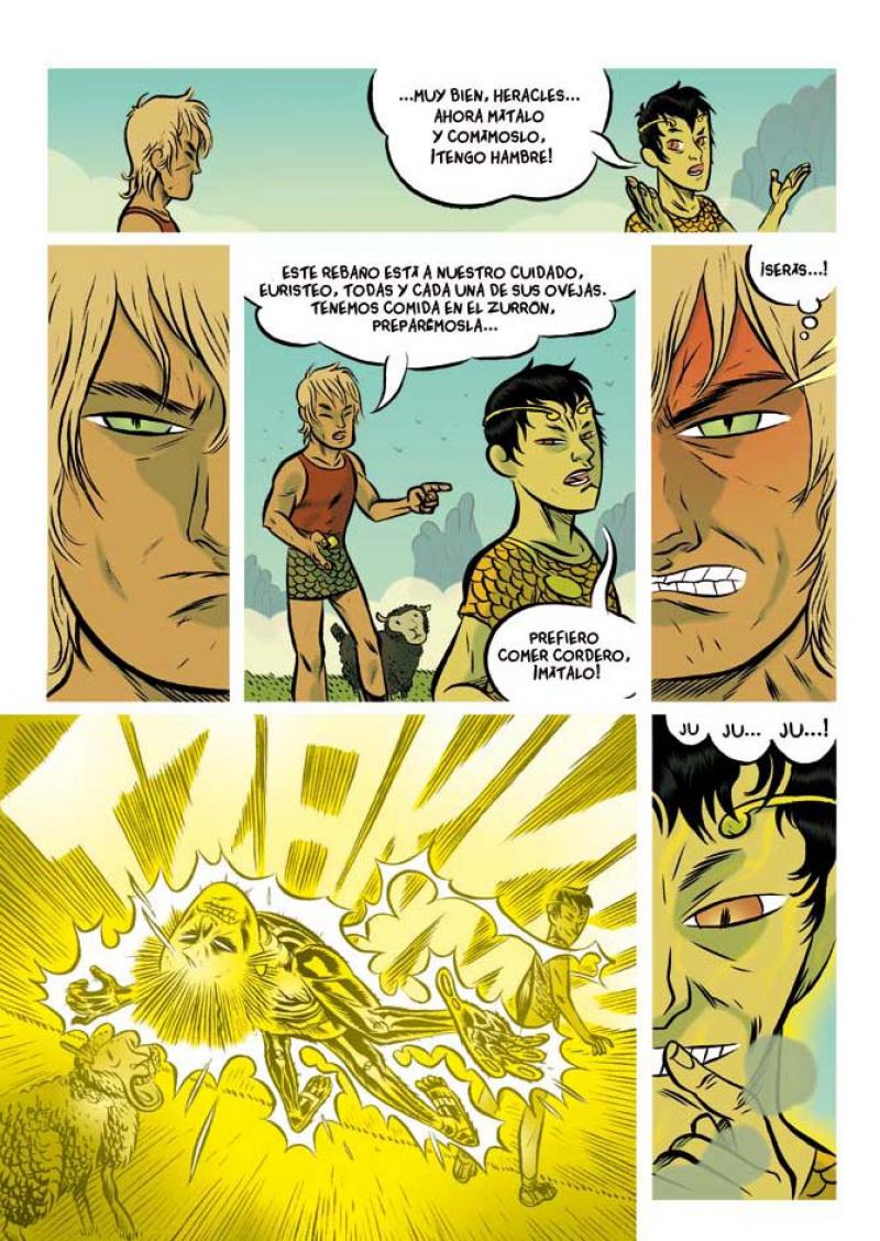 O que me interesa nesta parte, sobre todo onde aparecen por vez primeira tanto Euristeo como Heracles, é sobre todo deixar claro desde estas poucas páxinas cales son as personalidades dos protagonistas. Desde aí constrúense as bases do personaxes, que logo irán mudando ao longo do relato, sobre todo a de Heracles, lembra o autor. No seu caso interesábame especialmente presentalo dando xa esa impresión de alguén que está por riba do normal. Para isto por exemplo nas dúas primeiras páxinas en que sae evitei amosar o seu rostro para que na terceira, cando o vemos por fin nun plano xeral e frontal, dese esa sensación de grandeza e de marabilla, alguén que aínda non é un heroe formado pero xa é alguén especial. Nestras tres páxinas de presentación de Heracles si que hai un xogo narrativo importante coa ocultación do rostro, xogo mesmo con planos subxectivos do personaxe.
