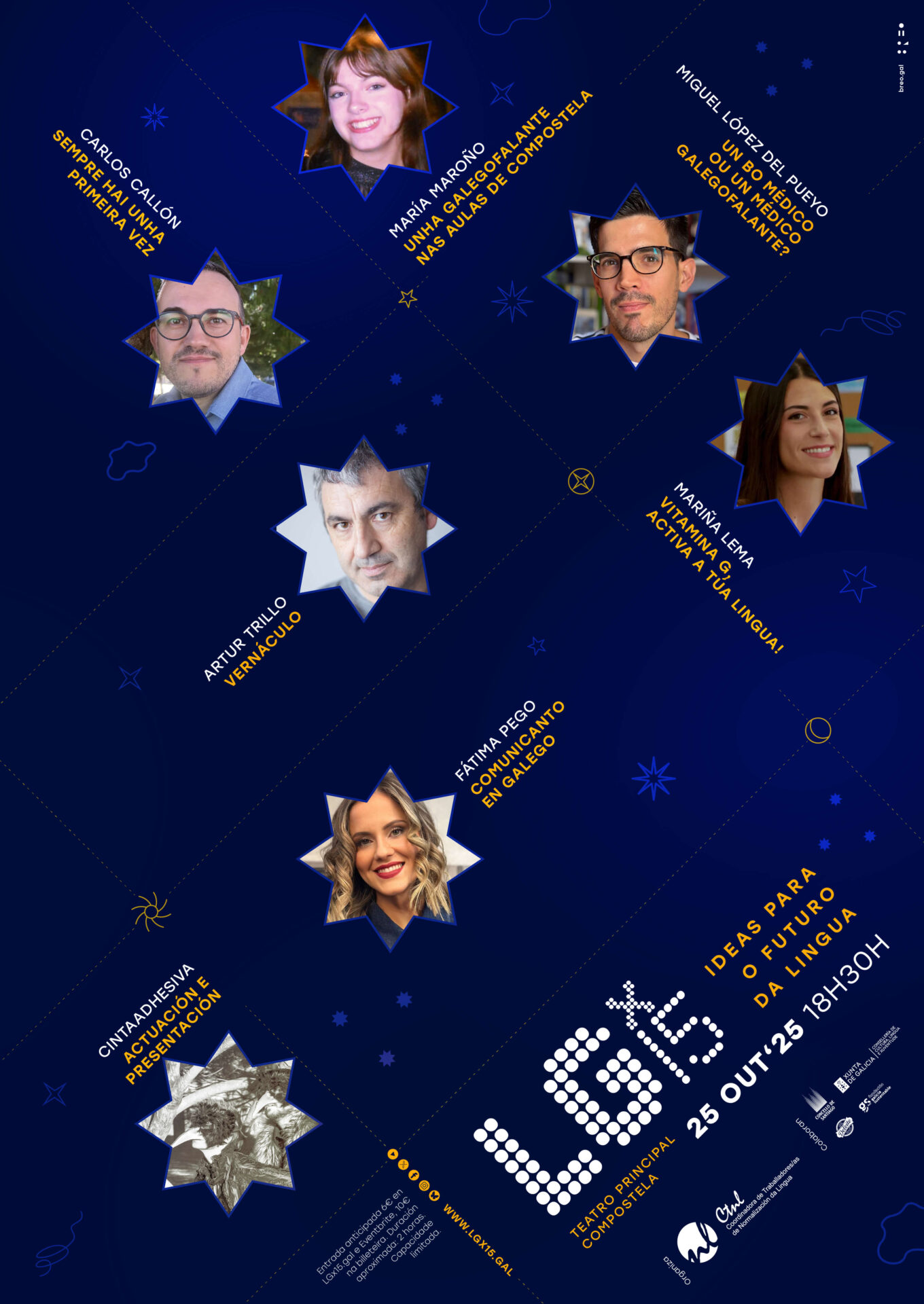 Mariña Lema presentará o proxecto Vitamina G, que emprega a lingua galega como factor de integración social, nun contexto cunha alta porcentaxe de nenos e nenas de orixe migrante. Artur Trillo centrará a súa intervención "Vernáculo" na importancia de manter os nomes na nosa lingua e Fátima Pego presentará "un percorrido persoal e emotivo" sobre como o galego influÃu na súa vida.